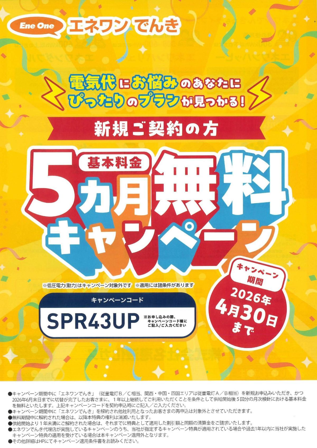 エネワンでんき「基本料金5ヵ月無料キャンペーン」のご案内